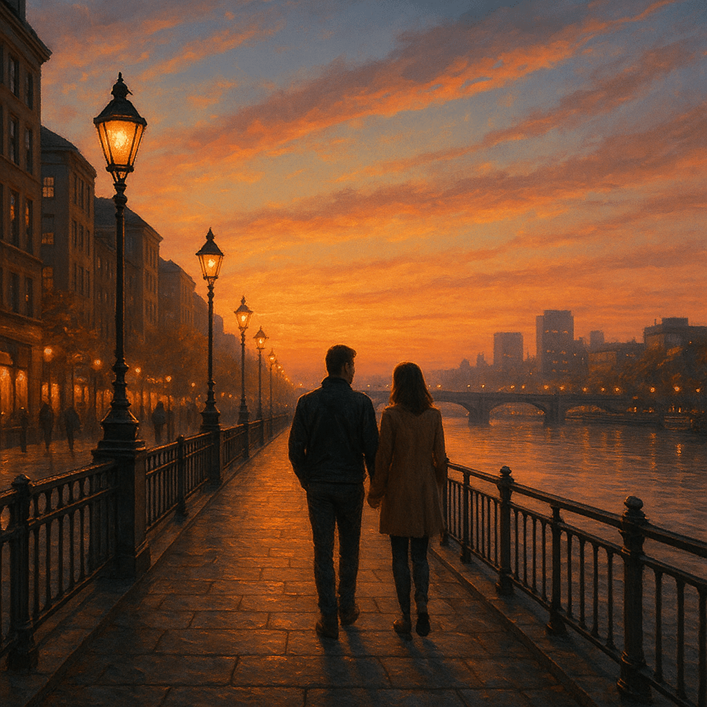 A walk by the river in the city as the sun sets.